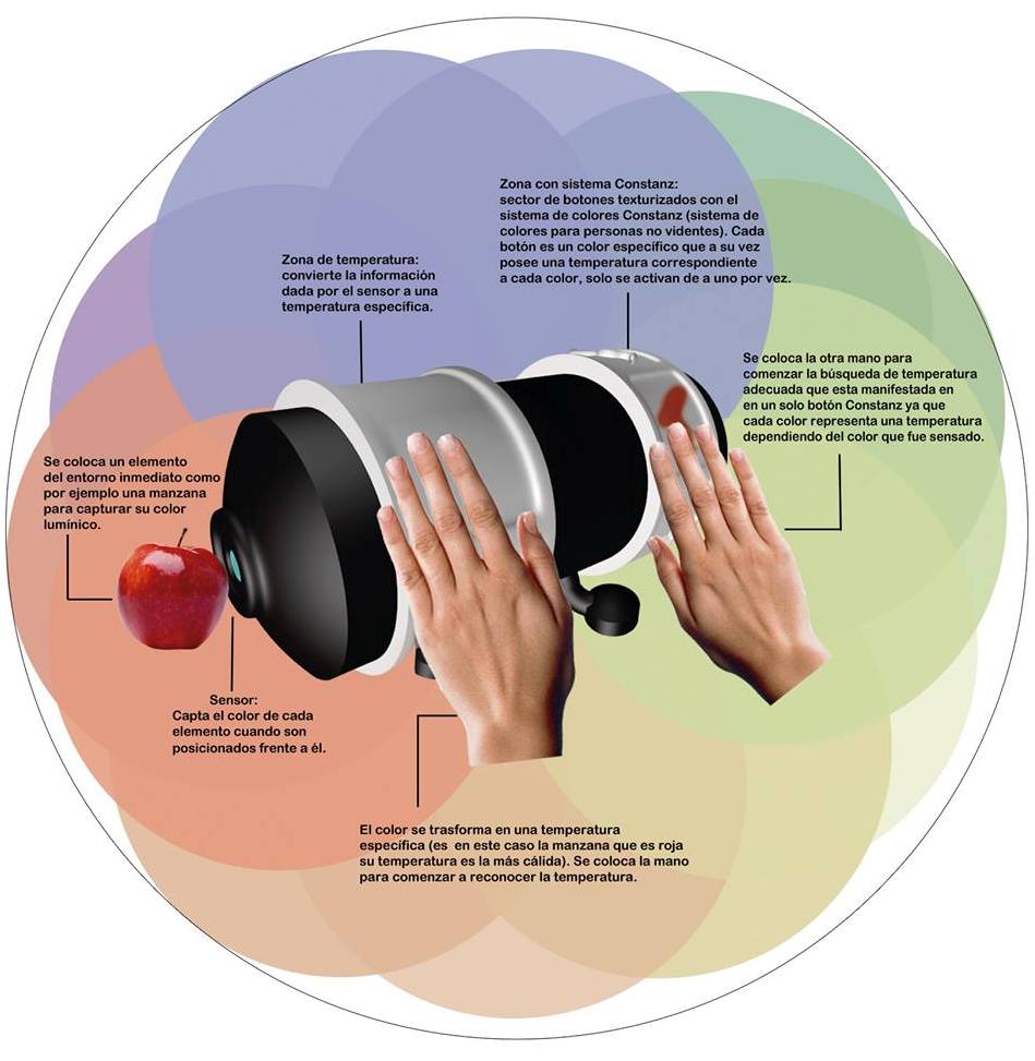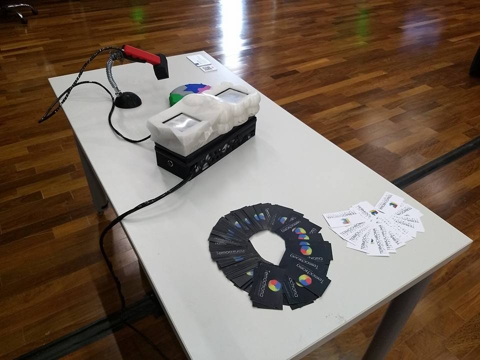Termochroma es un dispositivo interactivo destinado a personas con nula o baja visión, como así también personas con cromatopsia, daltonismo o cualquier trastorno cromático de la visión. Este dispositivo brinda la posibilidad de captar las cualidades cromáticas de los objetos por vías no visuales. Tiene la capacidad de transformar las propiedades visuales del color en temperaturas físicas, en un espectro que va de lo frío a lo cálido.